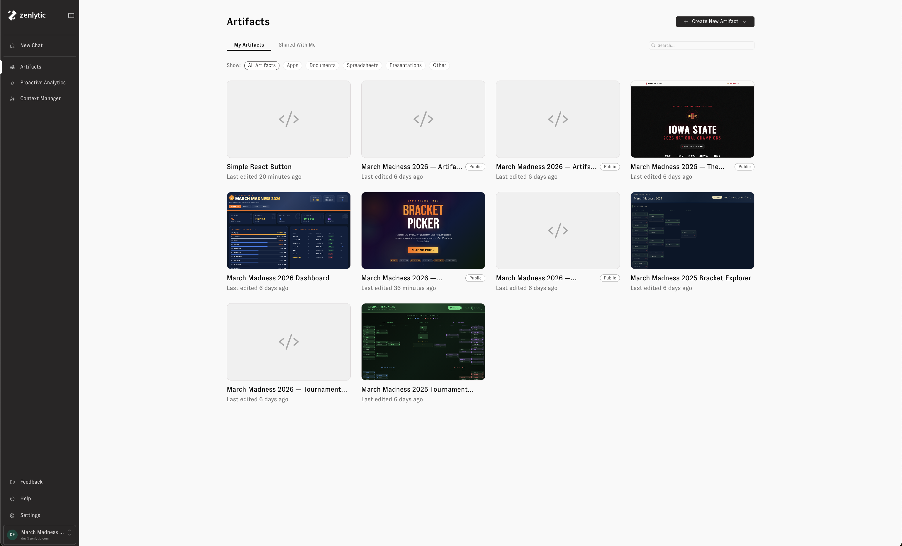 Each artifact displays a thumbnail preview, its name, and when it was last edited. Filter by type using the chips below the tabs — **All Artifacts**, **Apps**, **Documents**, **Spreadsheets**, **Presentations**, or **Other** — to quickly narrow down what you're looking for. Use the search bar in the upper right to find a specific artifact by name.