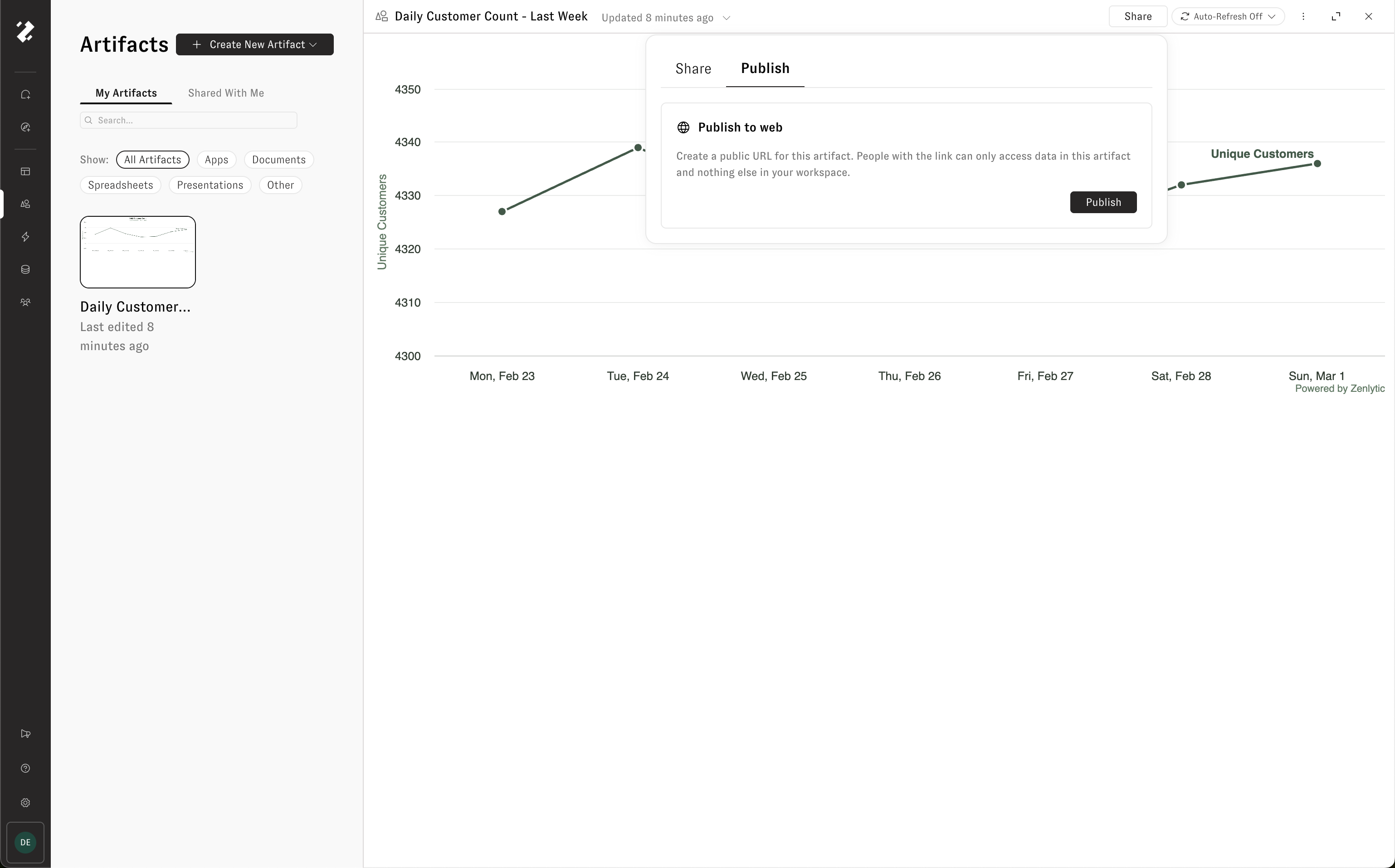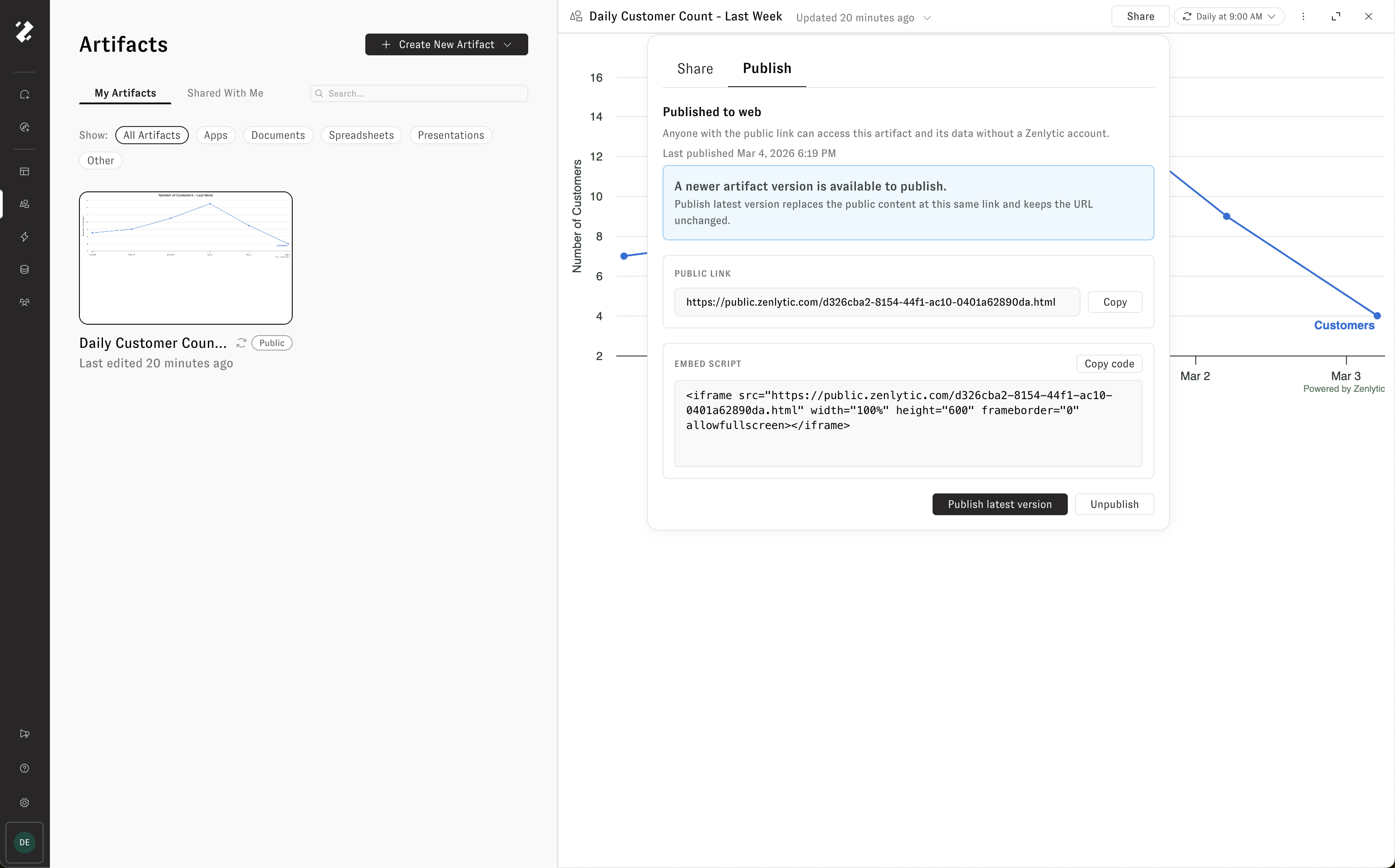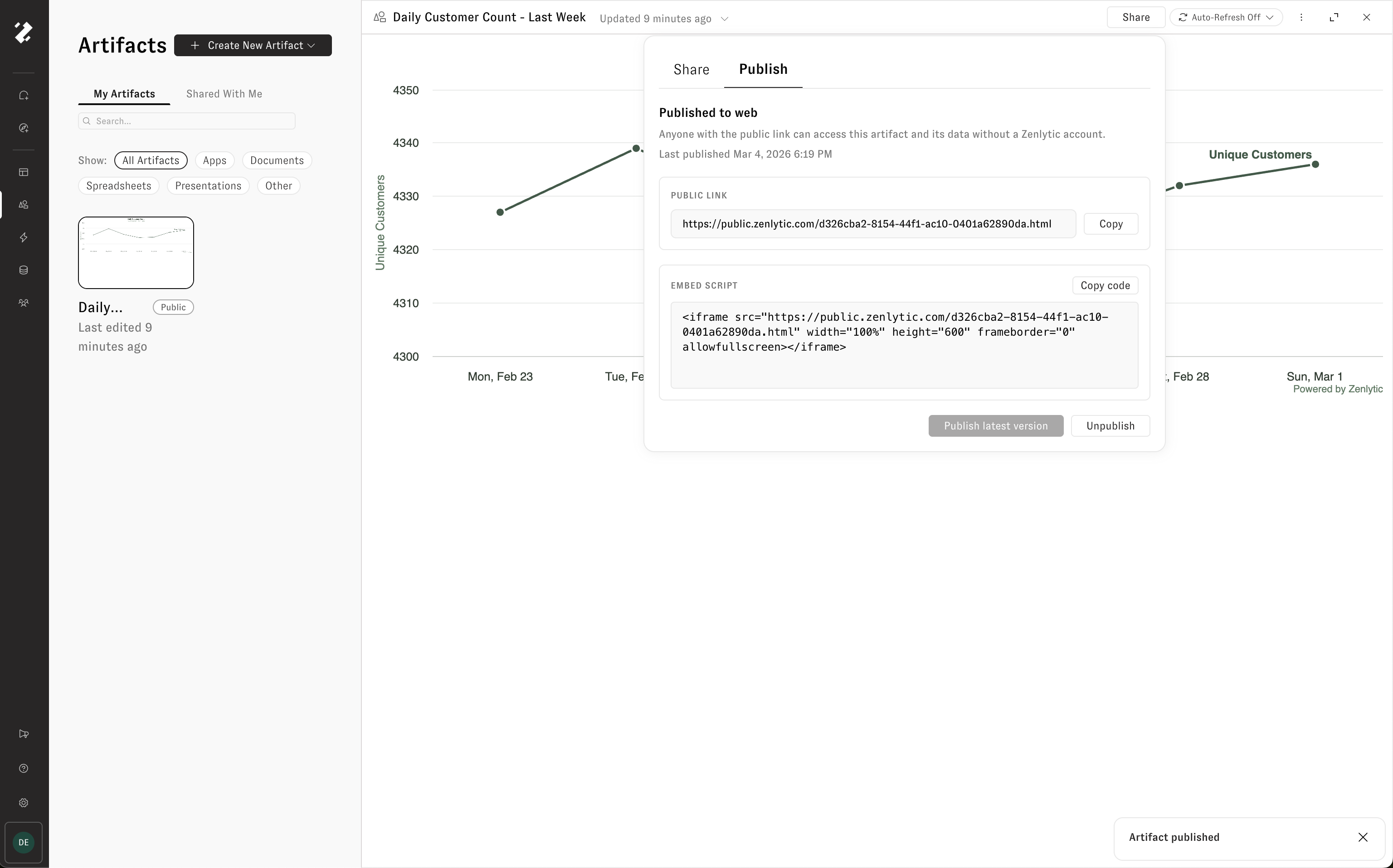 To make an artifact publicly accessible, click the **Share** button and open the **Publish** tab. Click **Publish** to generate a unique public URL and an embed script that anyone can use to access the artifact — no Zenlytic account required.