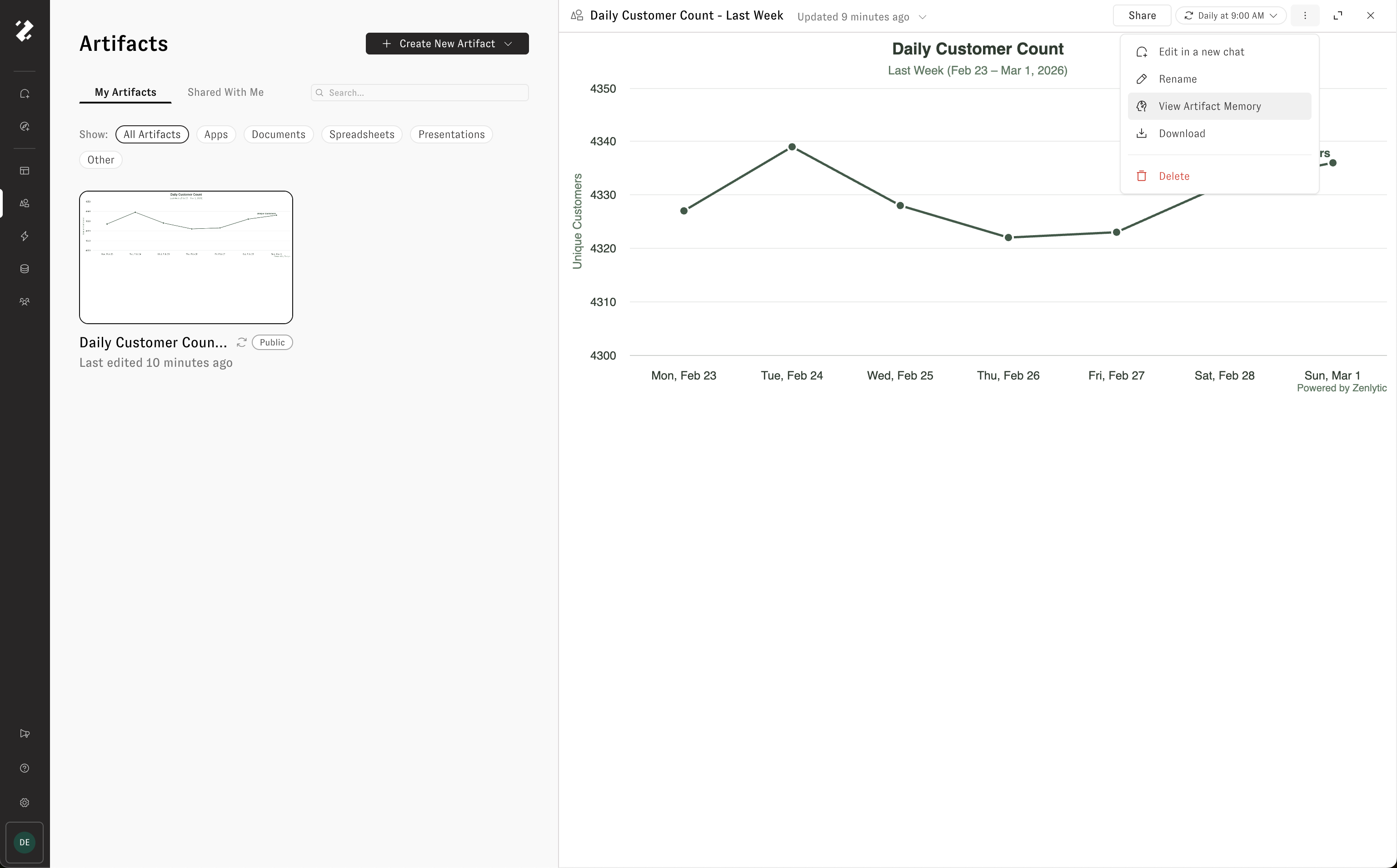 Click any artifact on the Artifacts page to open it in a side drawer. From the drawer you can preview the artifact, share it with others in your organization, or schedule it for automatic refresh.