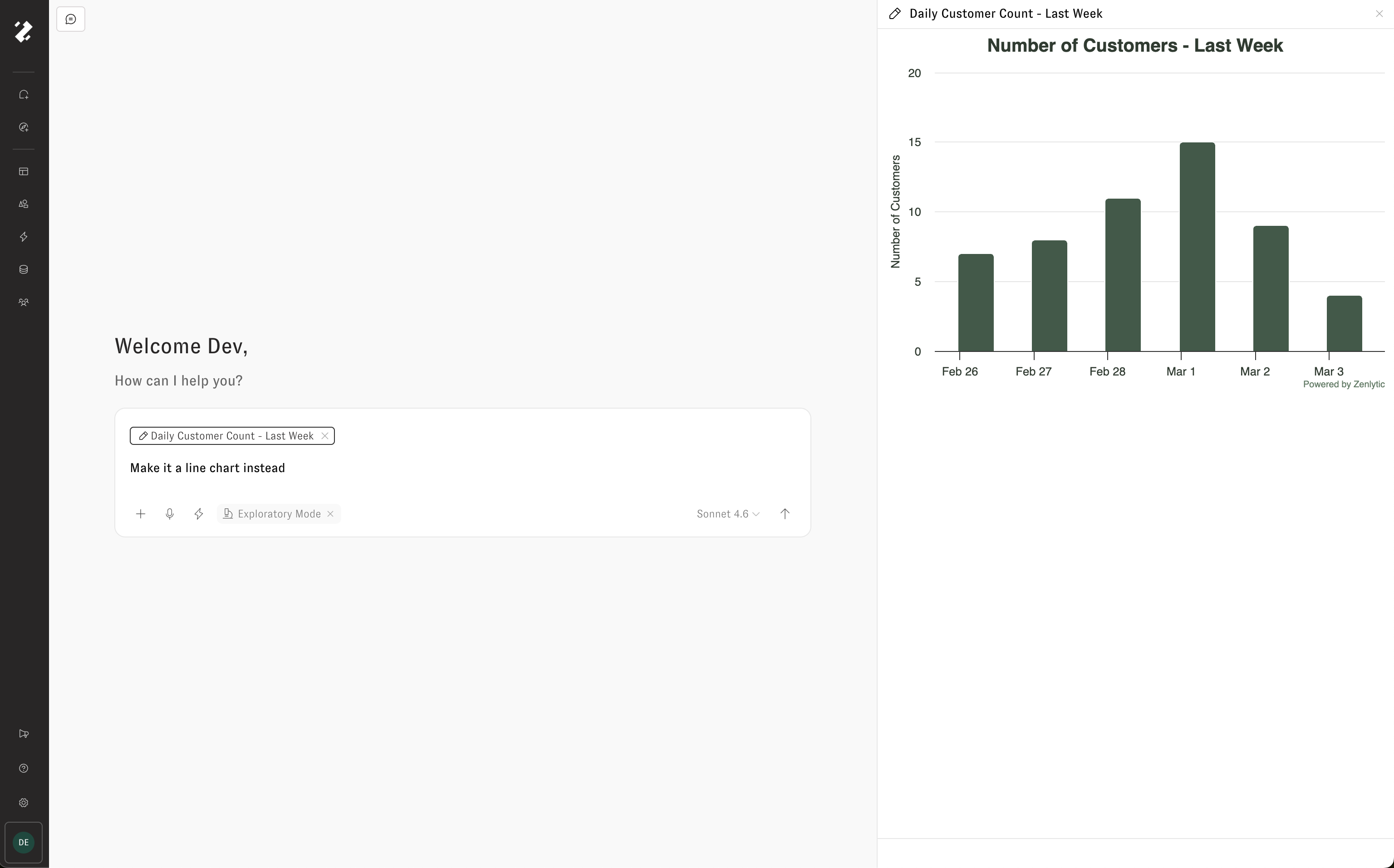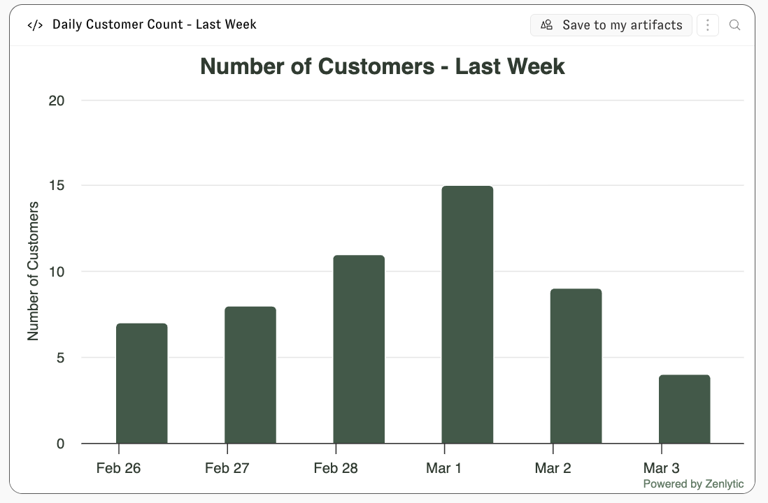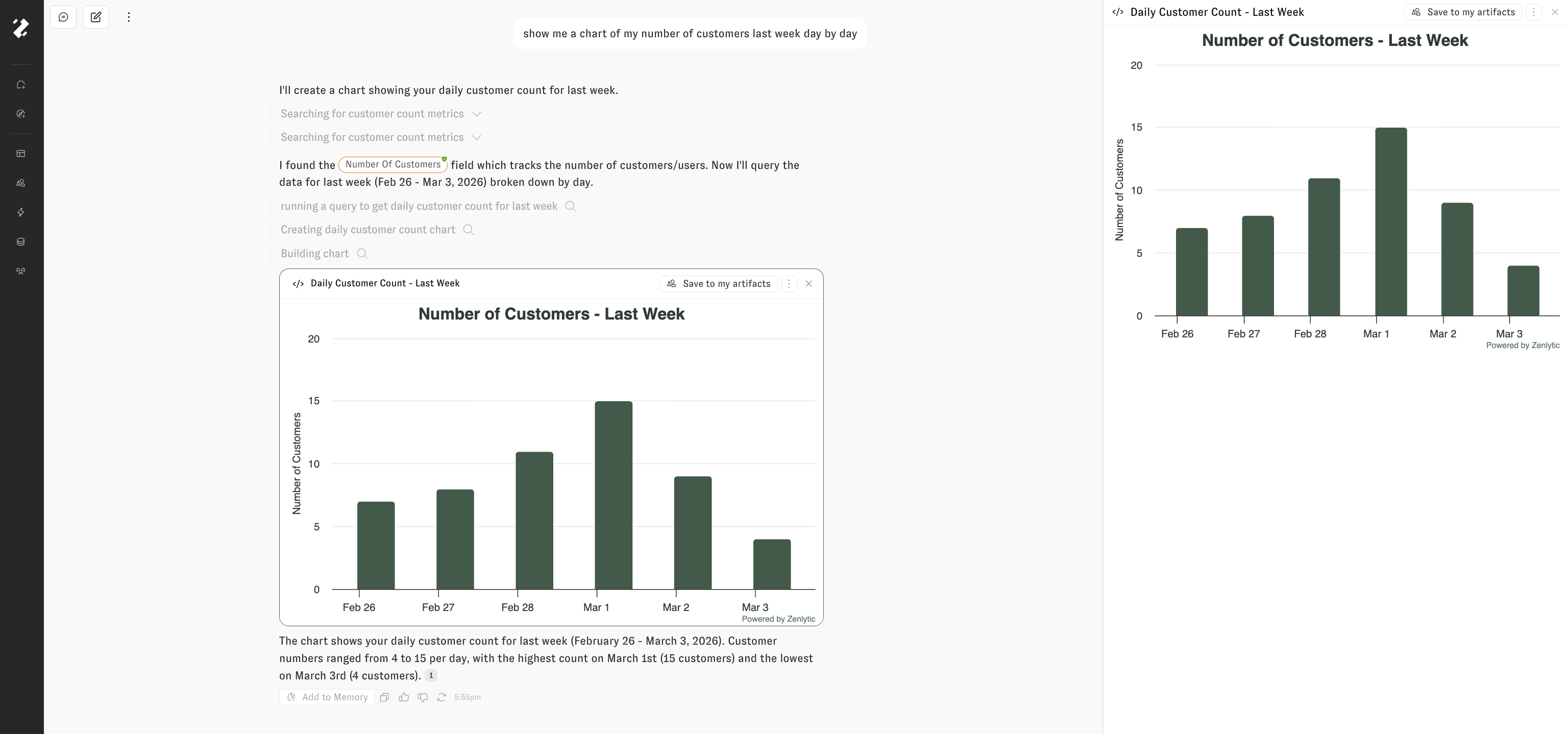 Zoë creates artifacts automatically whenever a visual output would be helpful — or when you ask her to build something. Artifacts appear inline in the chat, and you can click on one to expand it in the side drawer.