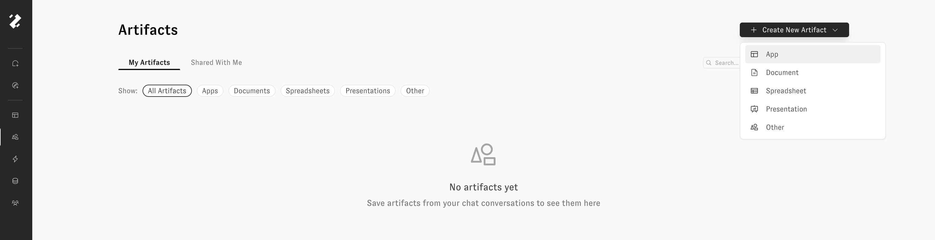 Click **Artifacts** in the left-hand navigation sidebar to see all of your saved artifacts. Use the tabs at the top to switch between: