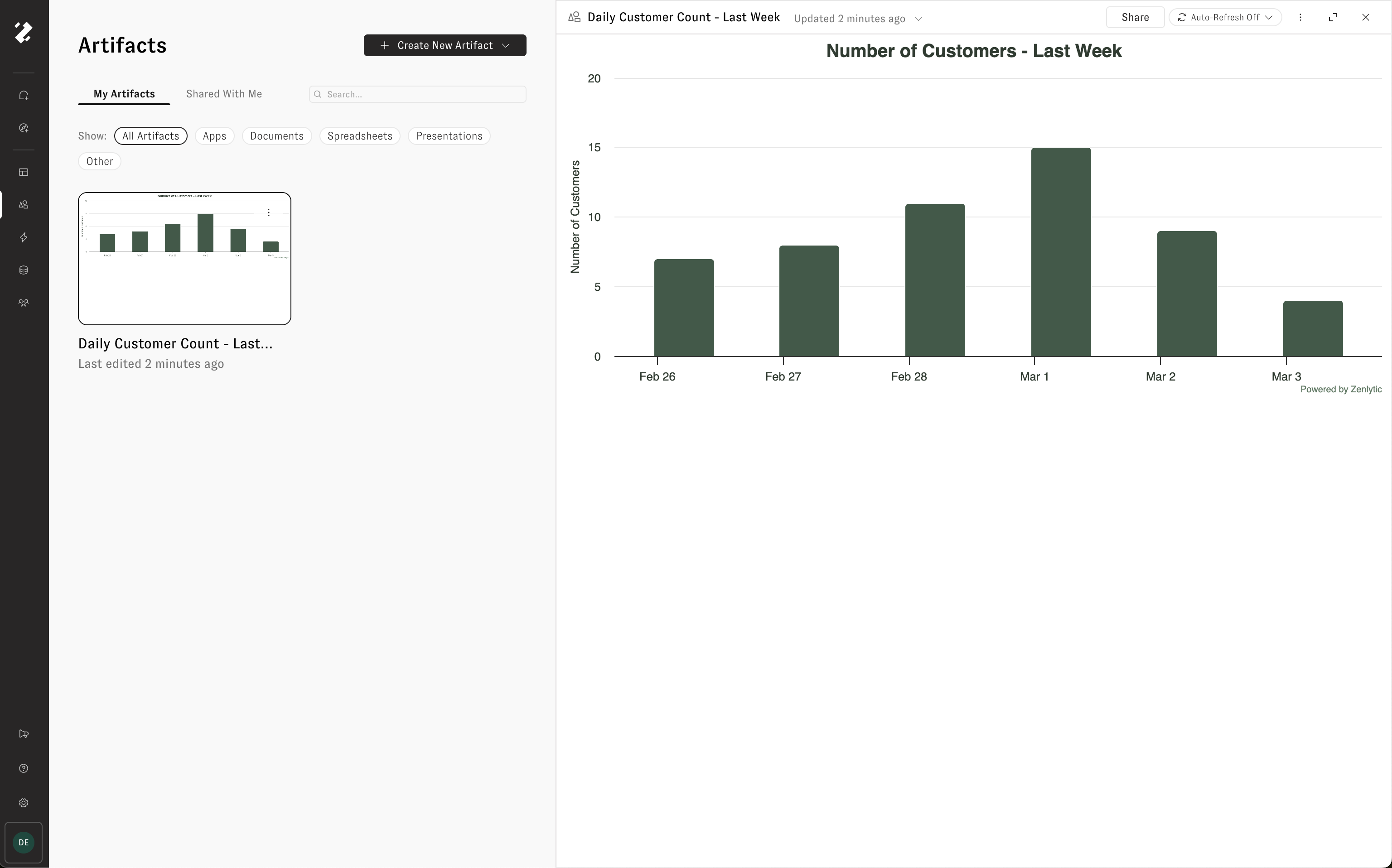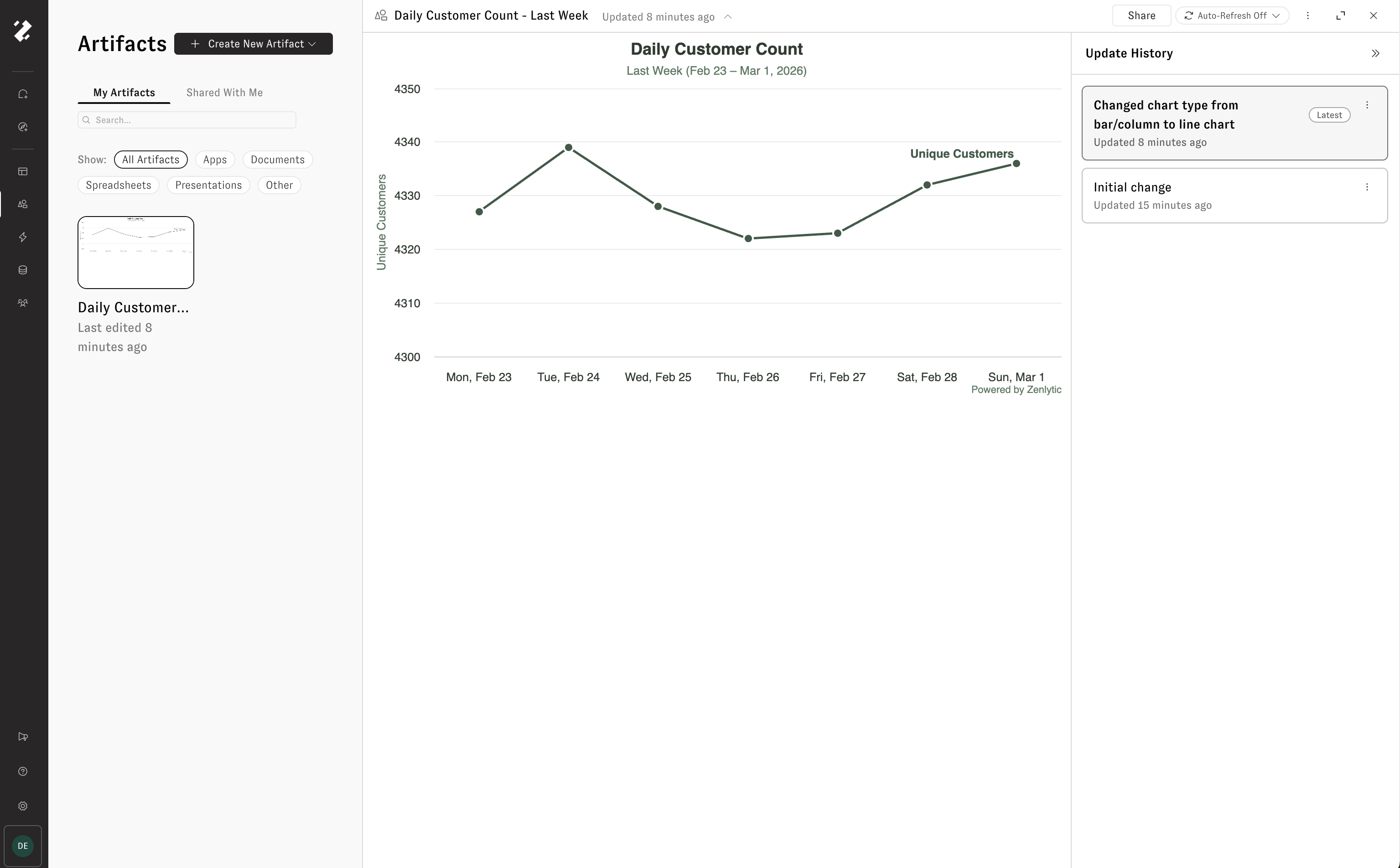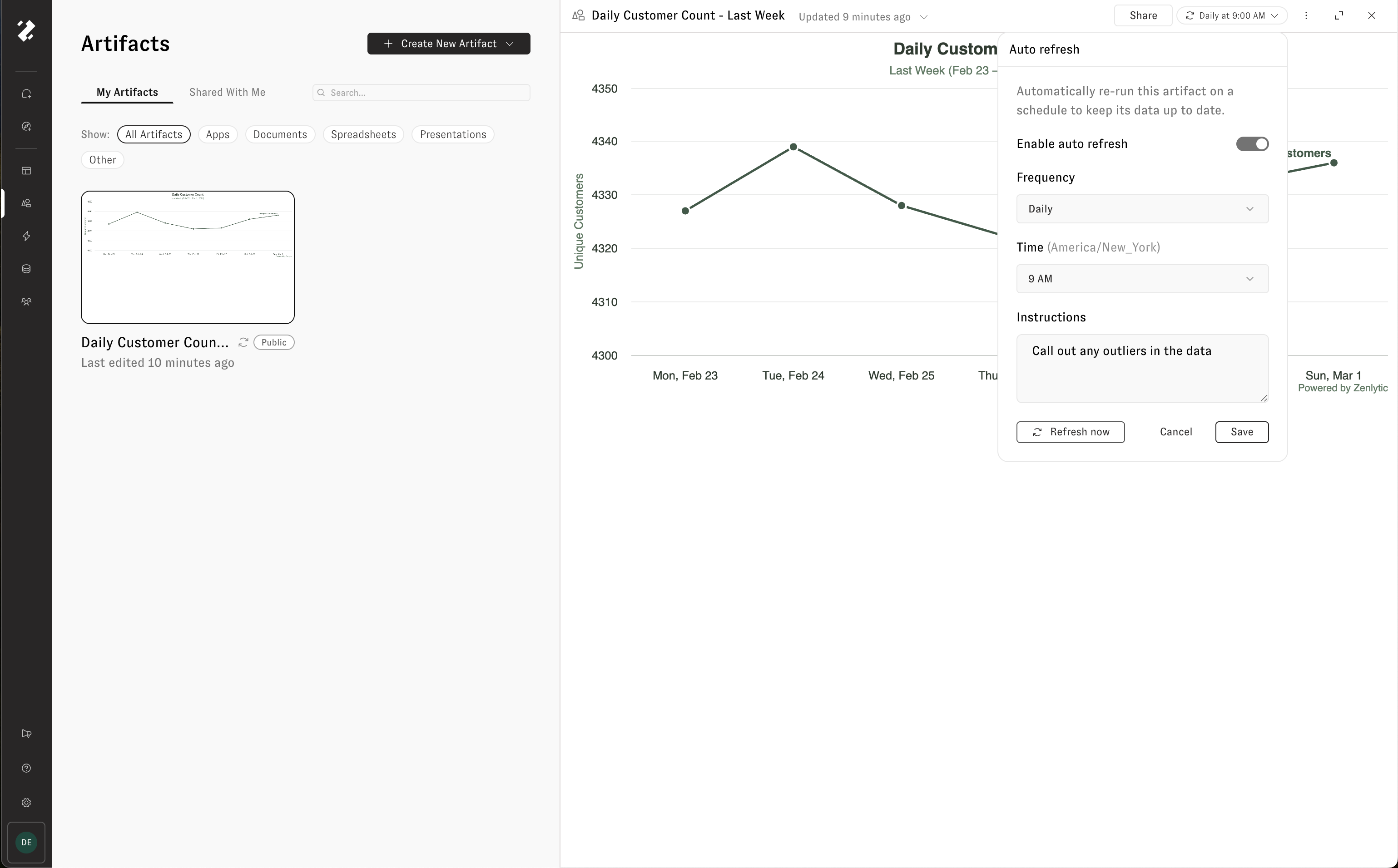 Keep an artifact's data up to date by enabling auto refresh. When turned on, Zoë automatically re-pulls the data and rebuilds the artifact on a schedule — so your dashboard, presentation, or writeup is always ready with live data.