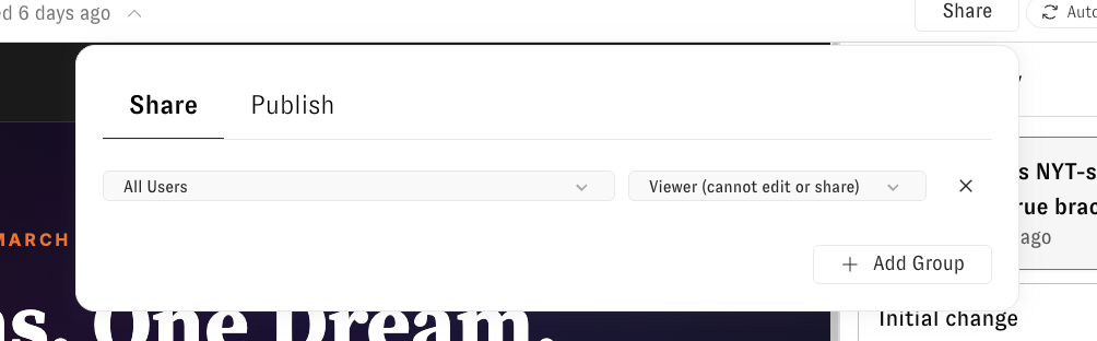 Click the **Share** button in the artifact drawer to share an artifact with others in your organization. From the Share tab, select a user group and assign a permission level. Click **+ Add Group** to grant access to additional groups.