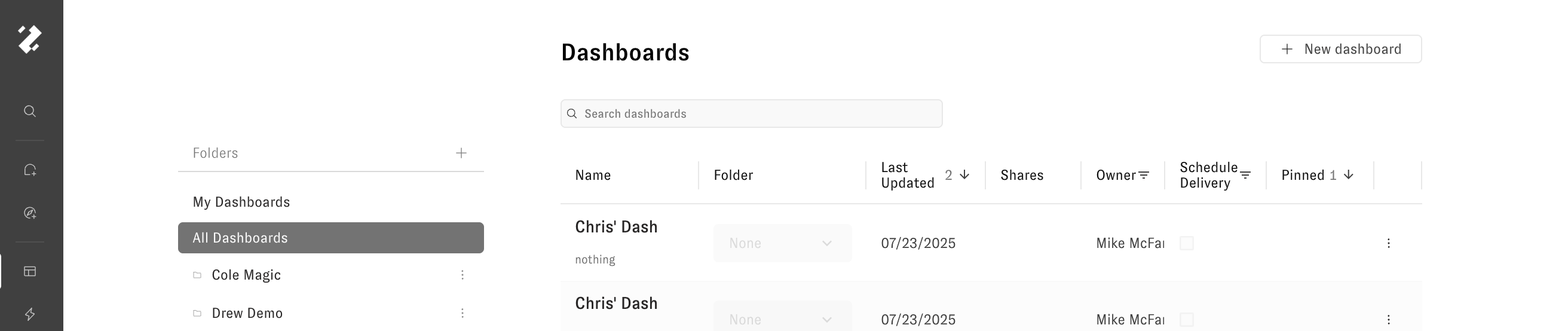 You can also access saved views of your data using dashboards. To get to the list of your company's dashboards, you can click on the Dashboards option in the top navigation bar. Then to go to a dashboard, click on it's name.